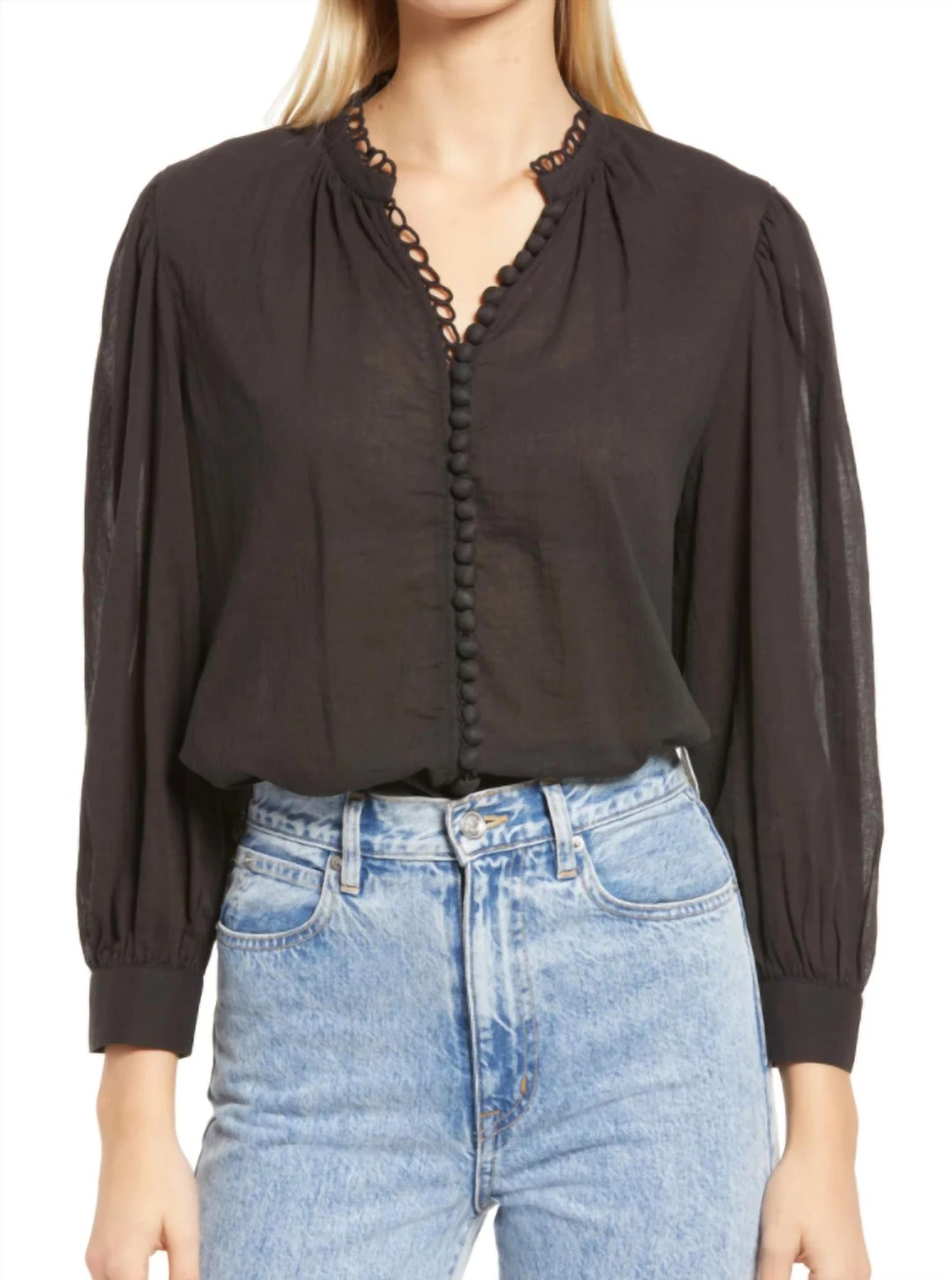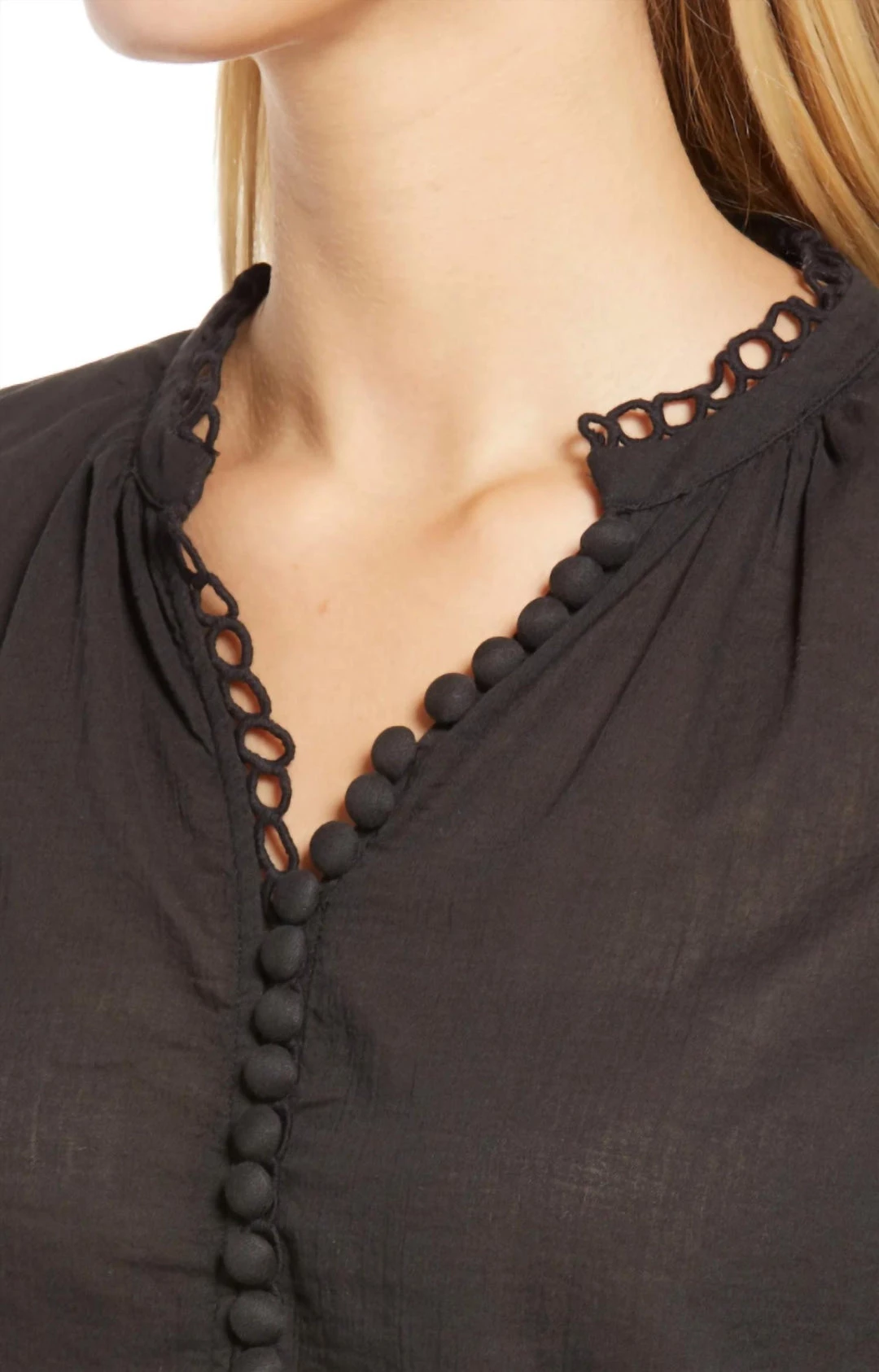 A row of fabric-covered buttons and embroidered loops detail a gauzy cotton blouse with a breezy boho spirit.รย