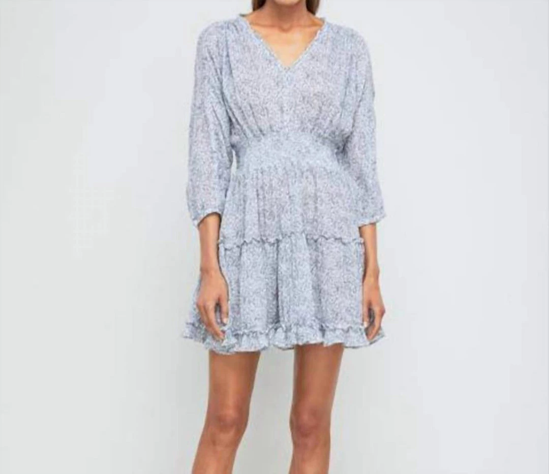 Smocked waist dress in floral print with layered ruffled full skirt. 3/4 sleeves.