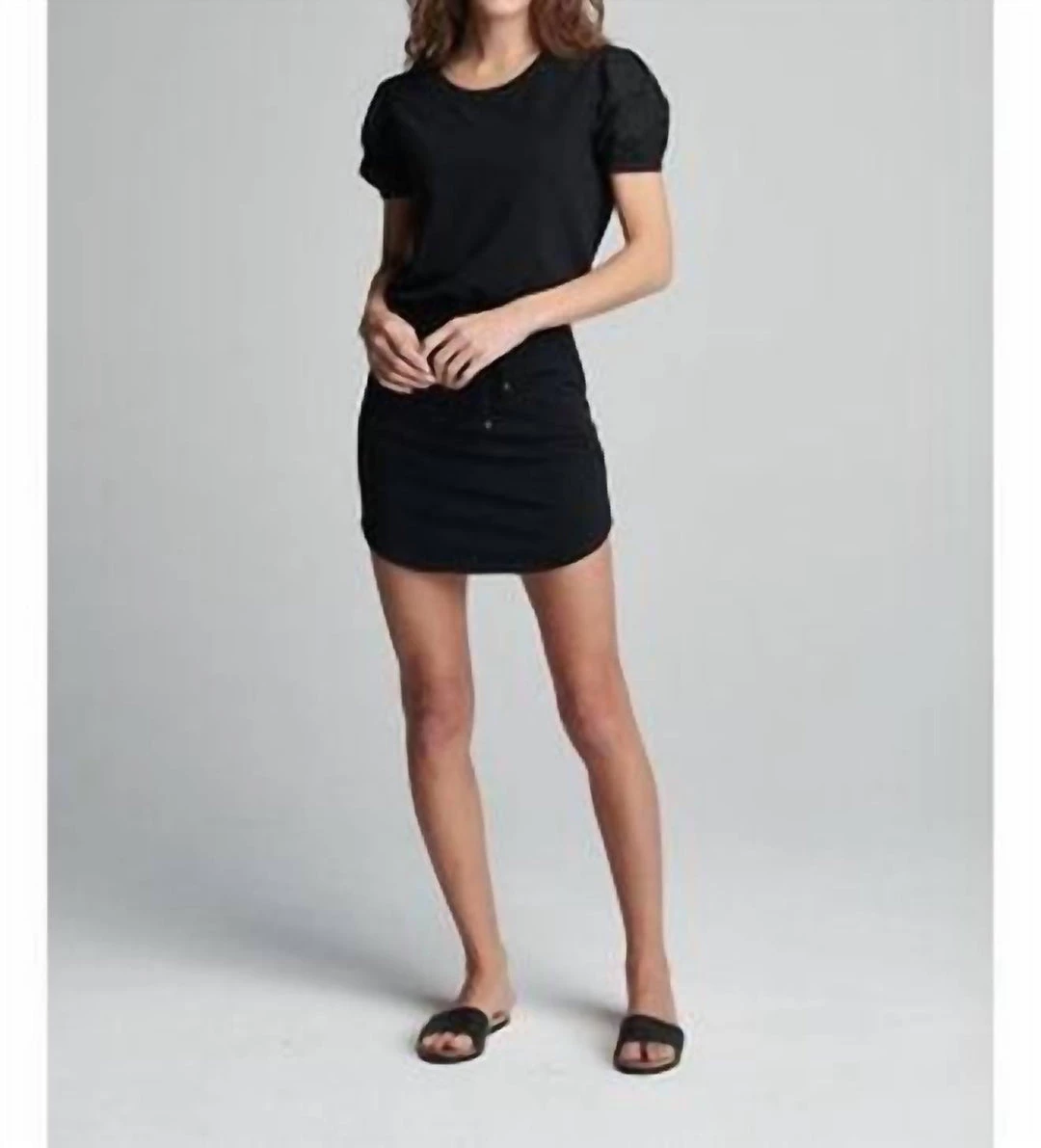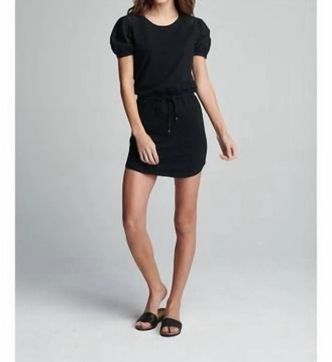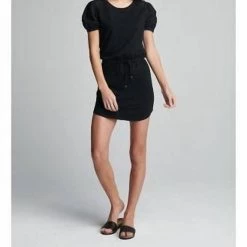 The perfect casual, little, black dress. The hazel dress features a drawstring waist and statement puff sleeves with floral, eyelet cutouts. 58% Cotton/37% polyester/5% spandex Machine wash cold