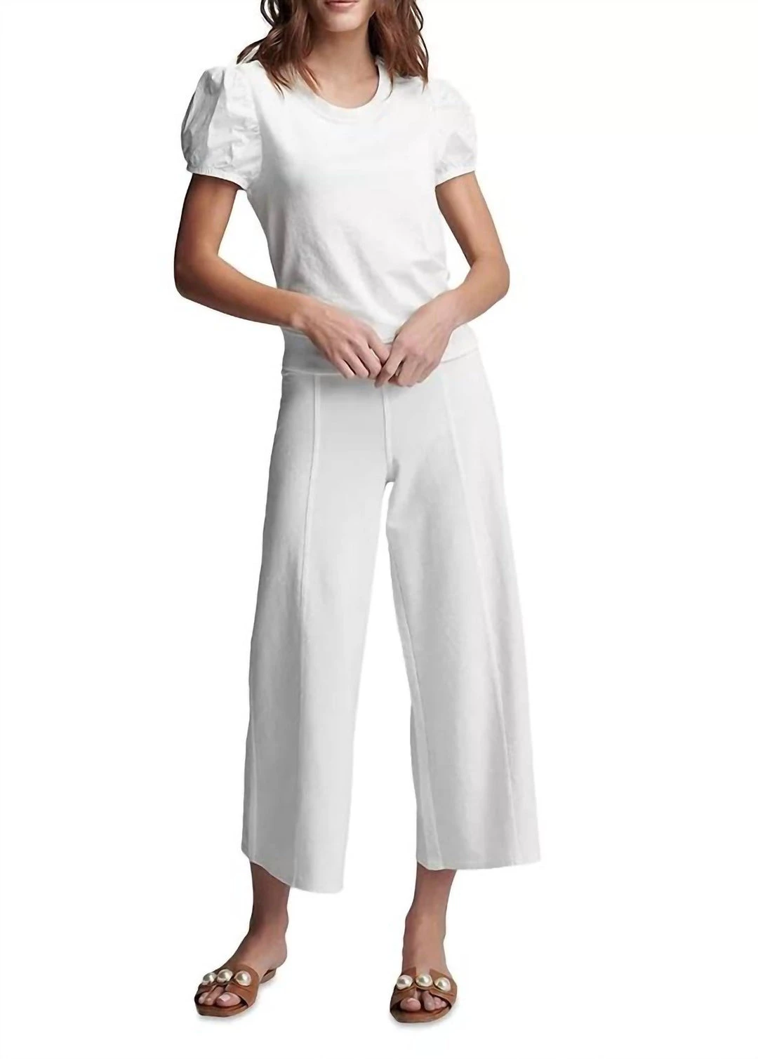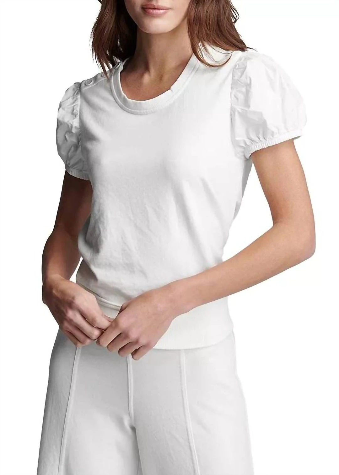 Crewneck. Short puffed sleeves. Pullover style. Ribbed at neckline and hem.