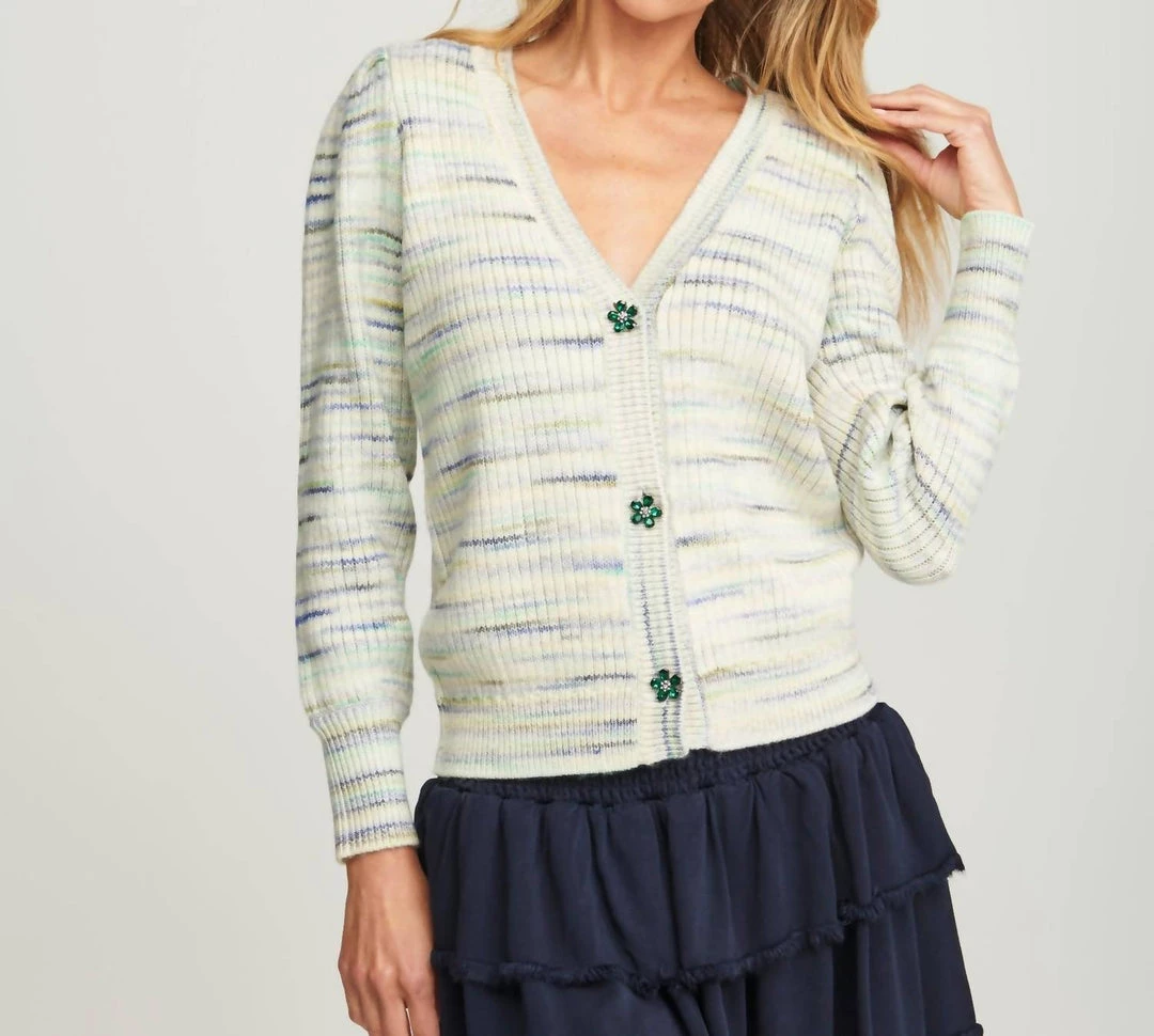 Space dye yarnSlightly croppedPleated puff sleeveFloral gem buttonsCotton blend