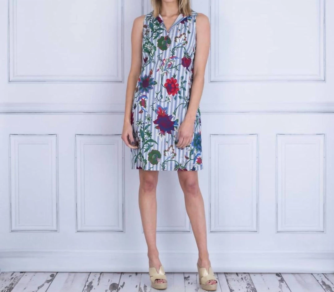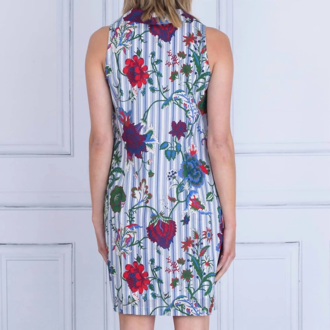Material – 100% CottonWash on 30Approximate Length – 78 cmOpen Collar NecklineStep out in style wearing this gorgeous sleeveless dress byΓΒ Vilagallo. This dress features an open collar neckline and stunning bold flower and stripe print. Perfect for a nice hot day or to take on your next holiday.