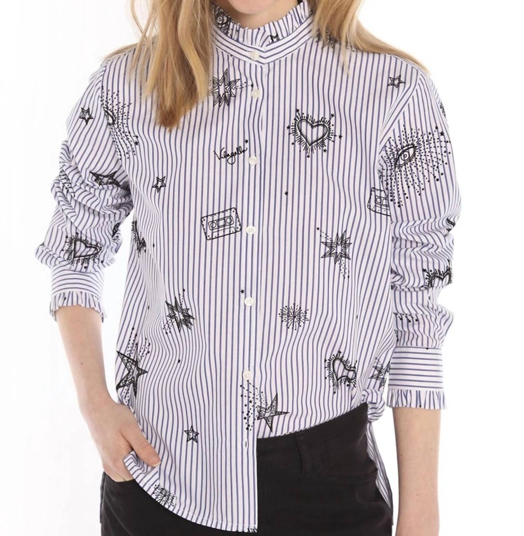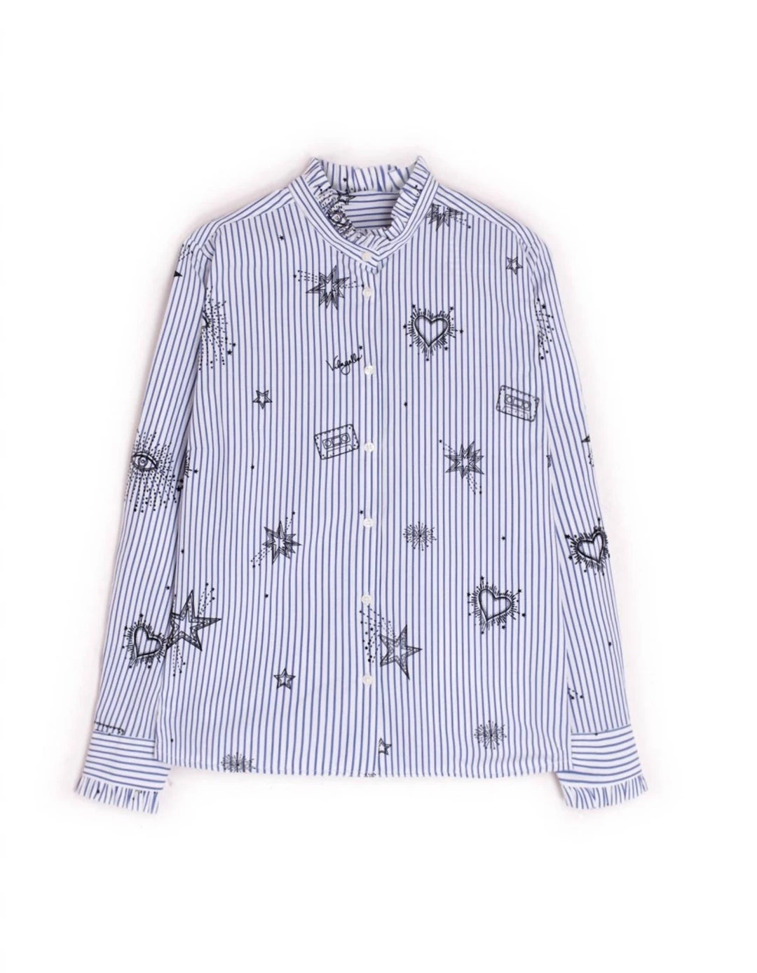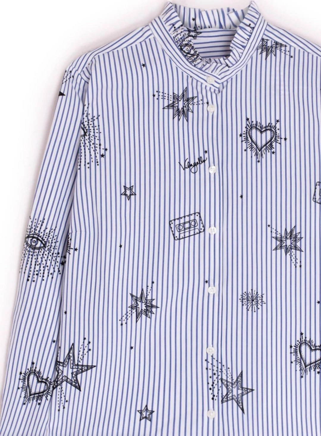 Poplin shirt with flocking blue stripes and exclusive designs of Vilagallo. Shirred collar with buttoning. Long sleeve with ruffle detail on the cuffs.