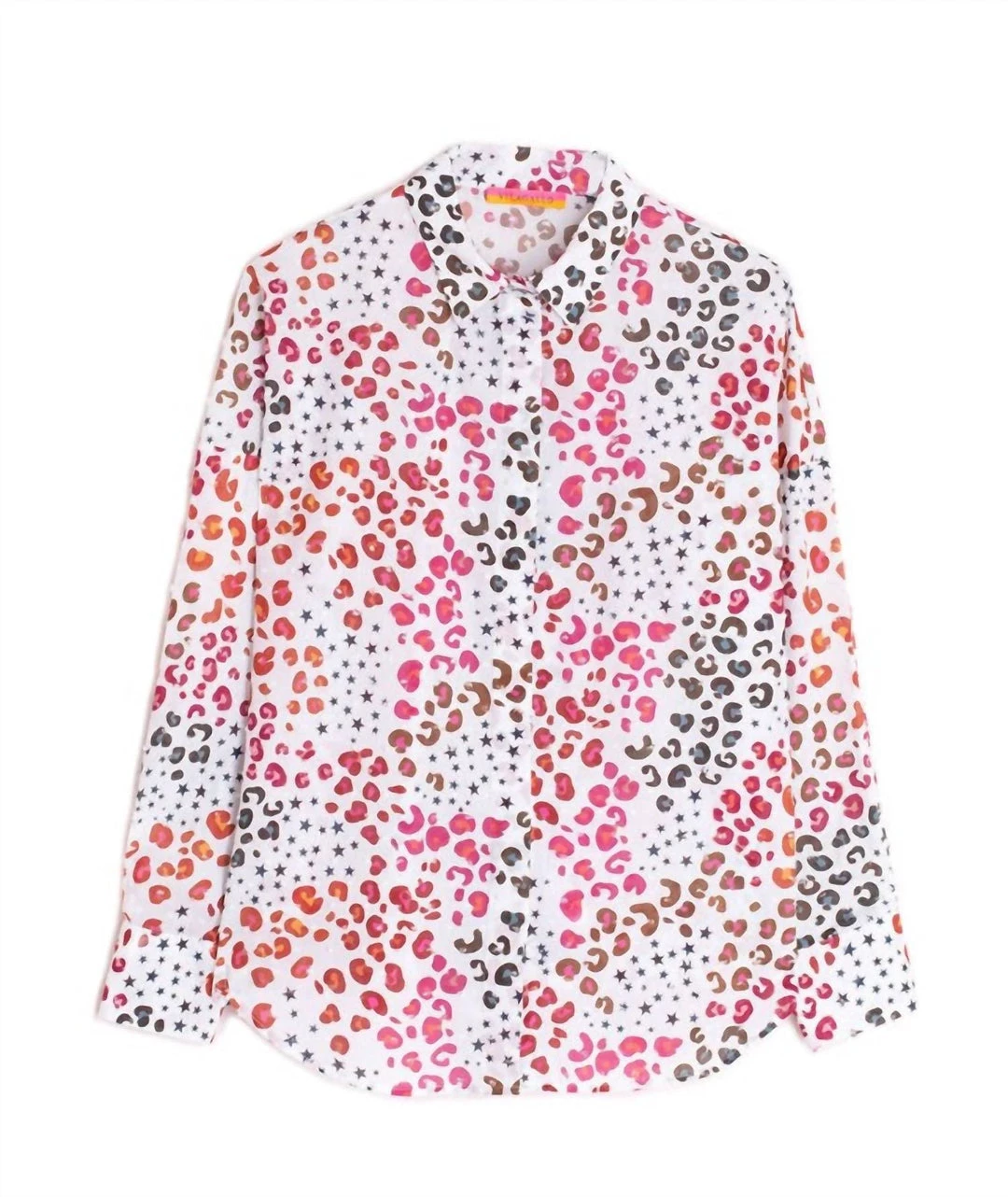 This fun button down is printed with a colorful assortment of stars and leopard spots .