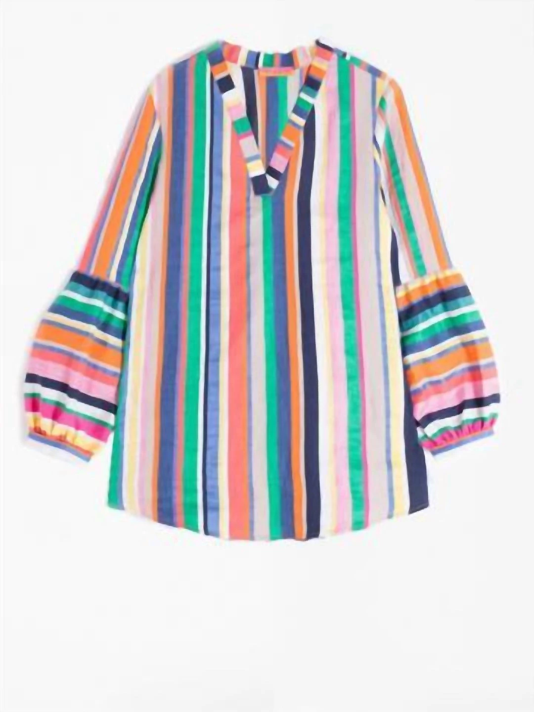 Have fun in this bold stripe top! Easy to pair with white denim and sandals to complete your summer date night look!ΓΒ Approximately 25in from shoulder to hemModel is 5’9 and is wearing a size 38. Measurements may vary slightly by size.Design details – V-neck design, half balloon sleeve, button cuffMachine Wash ColdImported